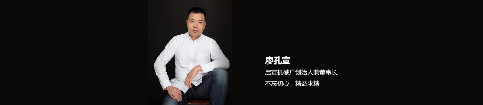 - 廖孔宣-瑞安市啟宣機(jī)械有限公司創(chuàng)始人兼董事長。 1989年在溫州梧田撕裂膜廠做工,2005年自己創(chuàng)辦了鵬博機(jī)械廠,誠信經(jīng)營,不忘初心,精益求精。之后機(jī)械廠正式改名瑞安市啟宣機(jī)械有限公司。